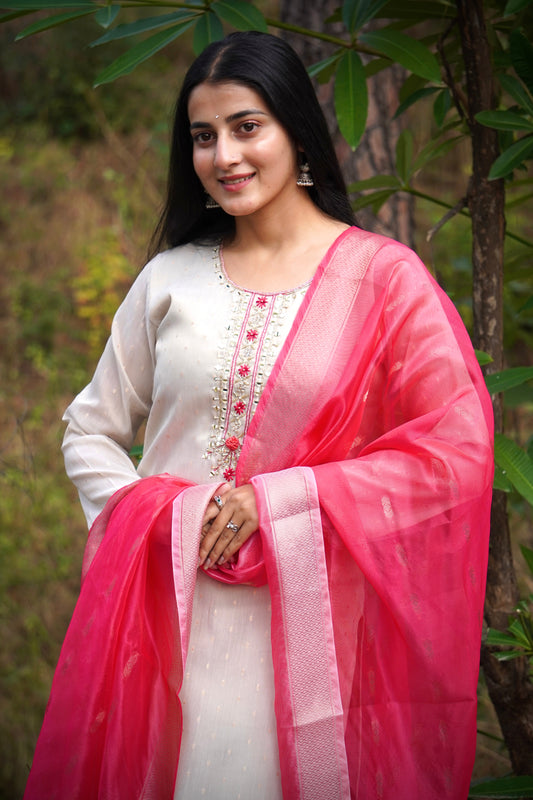 Featuring Fully Elegant Premium Muslin Suit Set Which is Beautifully Decorated With Hand Khatli Work And Original Mirror Work With Butti Pattern.(WARED09)
