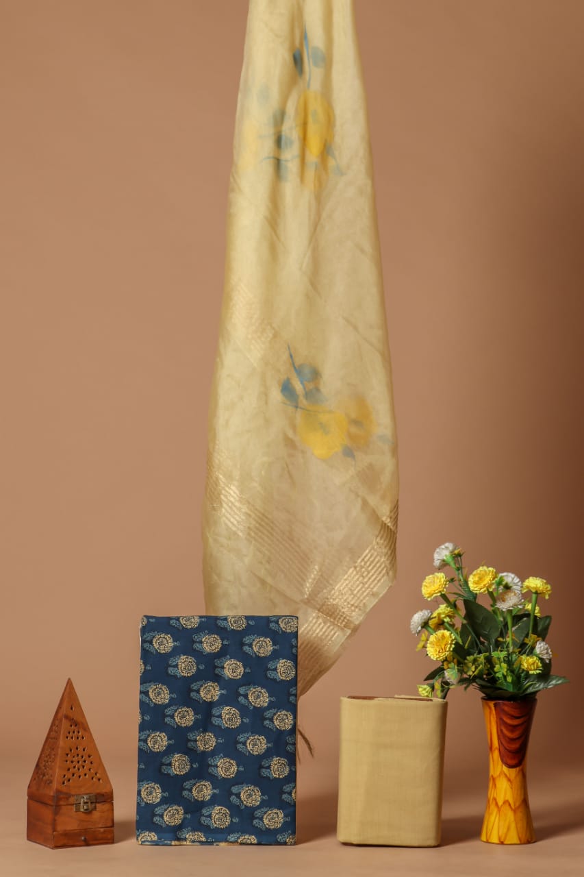 Shop unstitched cotton suit with organza dupatta. Hand block printing is a centuries-old Indian art form that uses a hand-carved teak woodblock to print garments. These garments are purely a work of artisans and unsymmetric in nature.