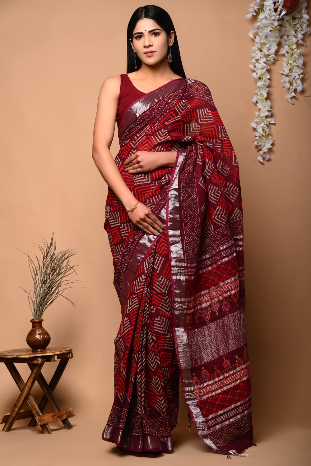 Handblock linen Printed Women's saree gives you great comfort, desired style and look and Fits most occassion and will make you Gaga over carrying a saree on every occassion.