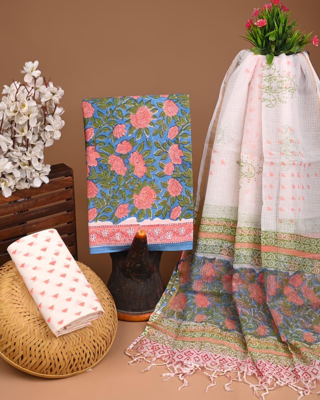 New Hand Block Print Cotton Suit Set with Kota Doria Dupatta
