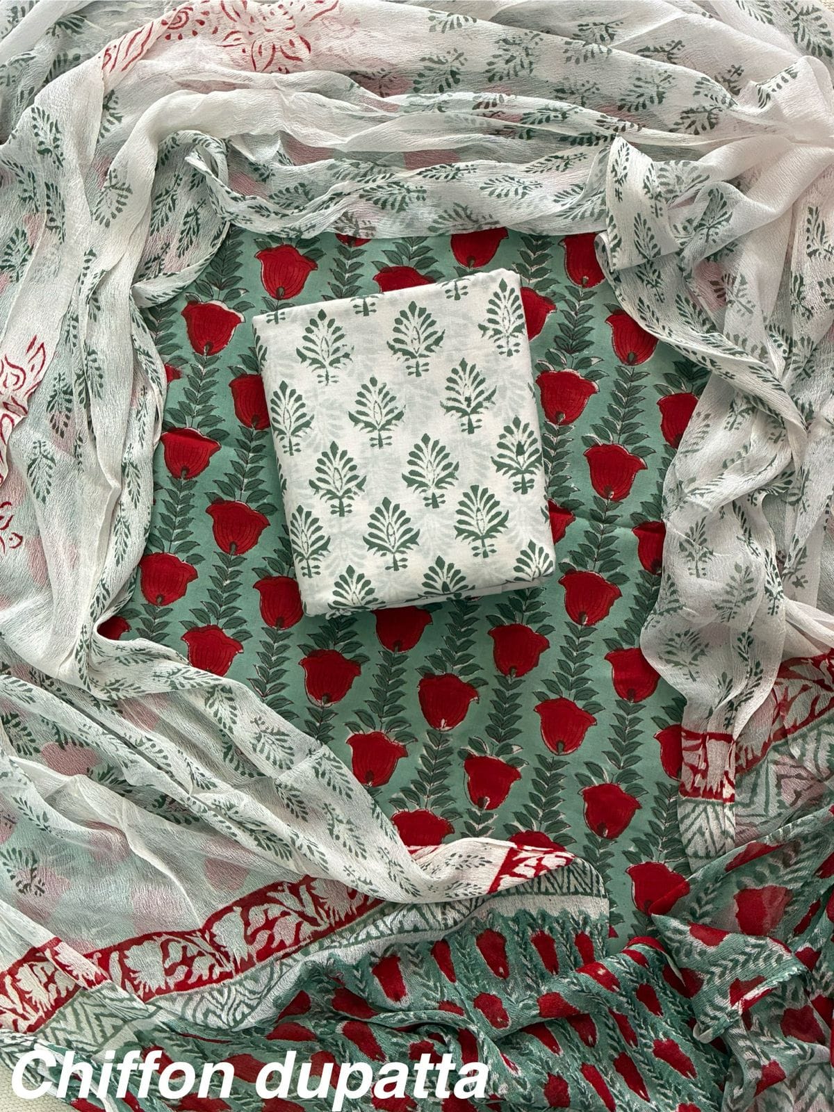 Premium Hand Block Print Cotton Suit Set with Chiffon Dupatta(WACFCOTMU17)