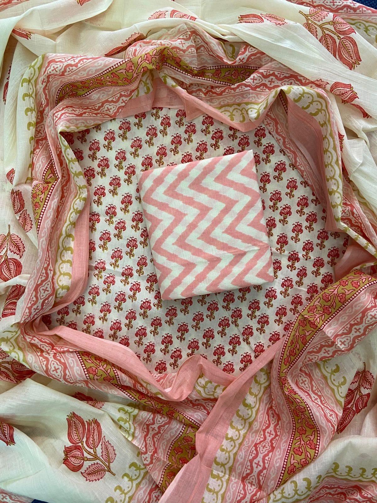 Designer Hand Block Print Cotton Suit Set with Mulmul Dupatta(WACOTMU126)