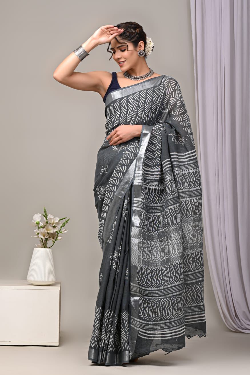 Hand Block Printed Linen Saree With Unstitched Blouse (SWSRLIL49)