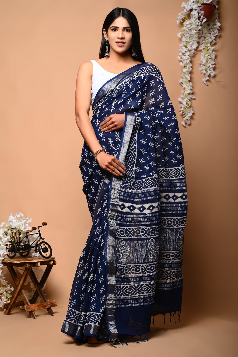 Handblock linen Printed Women's saree gives you great comfort, desired style and look and Fits most occassion and will make you Gaga over carrying a saree on every occassion.