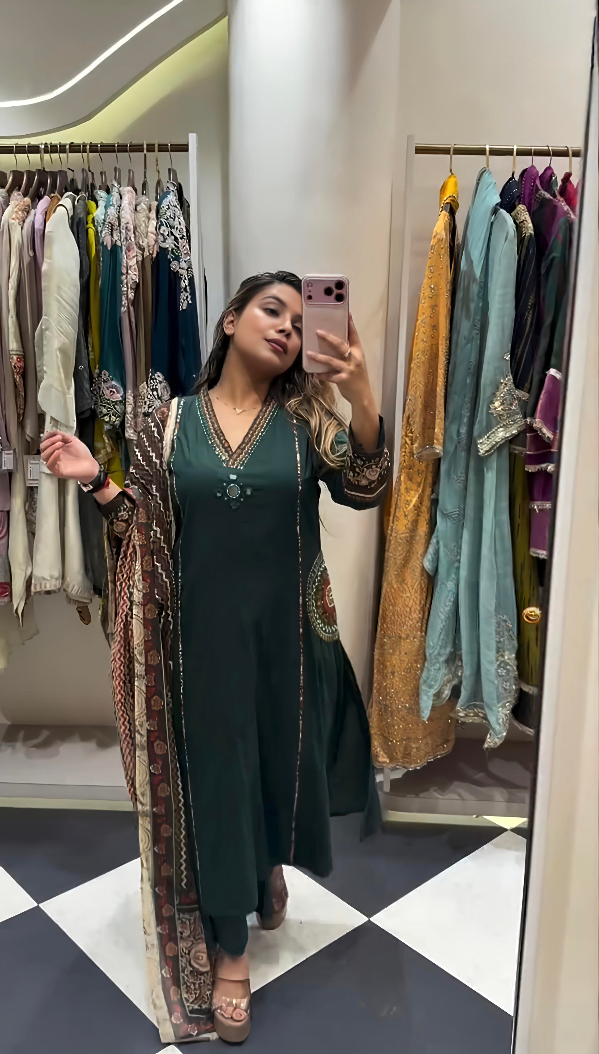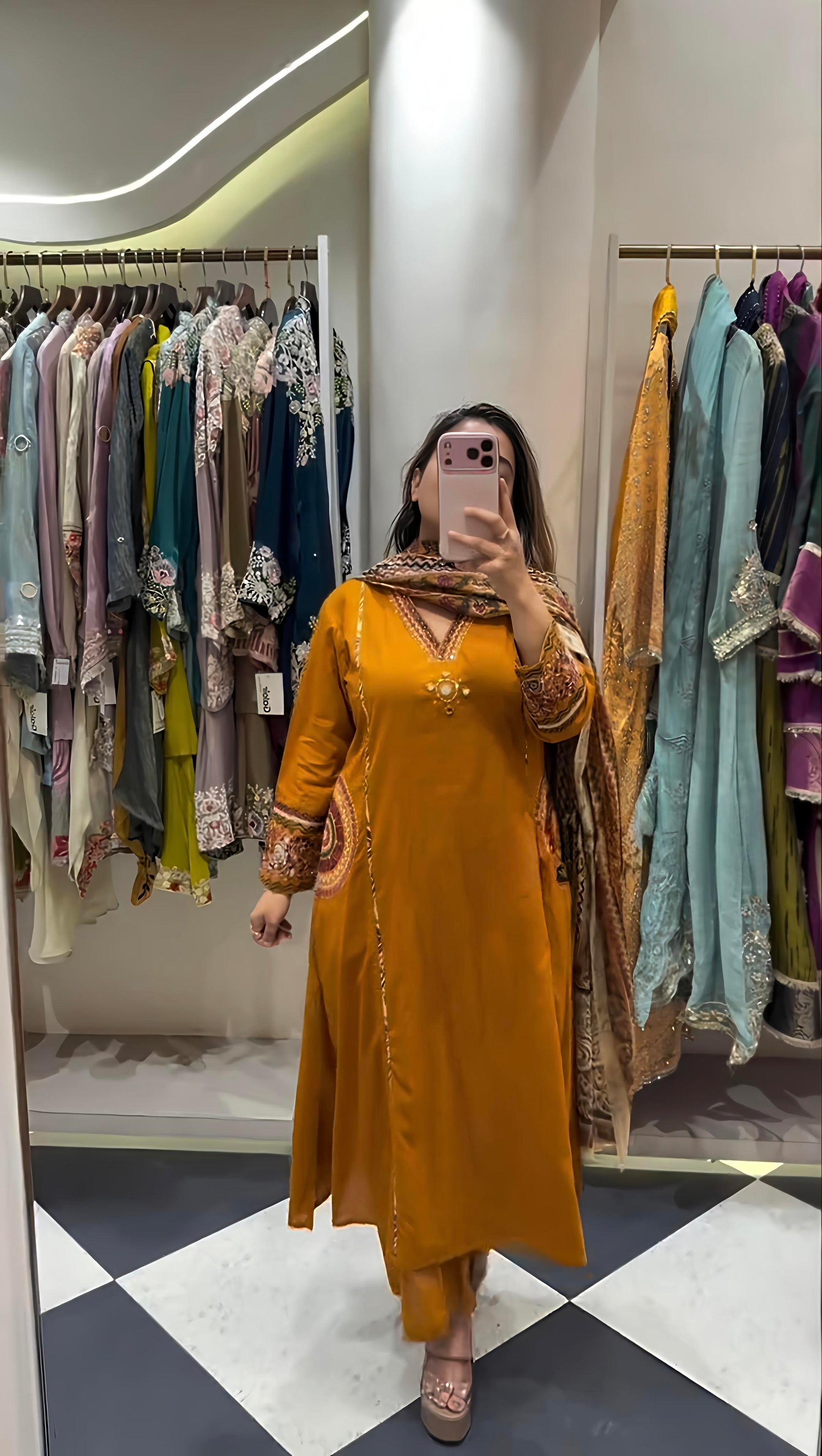 *Featuring beautiful Heavy Suit Set which is beautifully decorated with weaving and embroidery with matching pants and dupatta.*