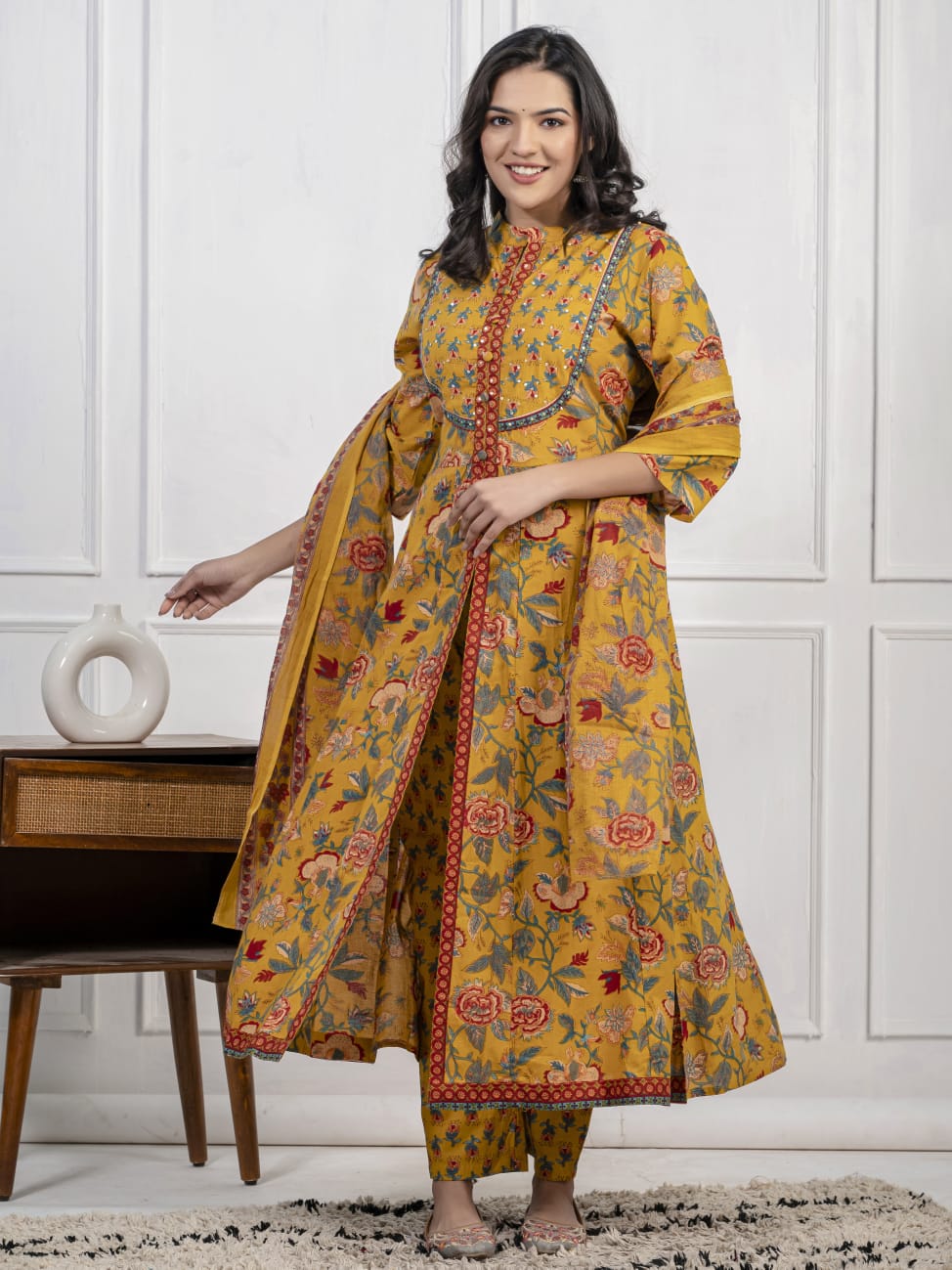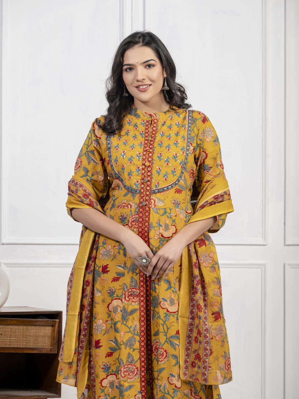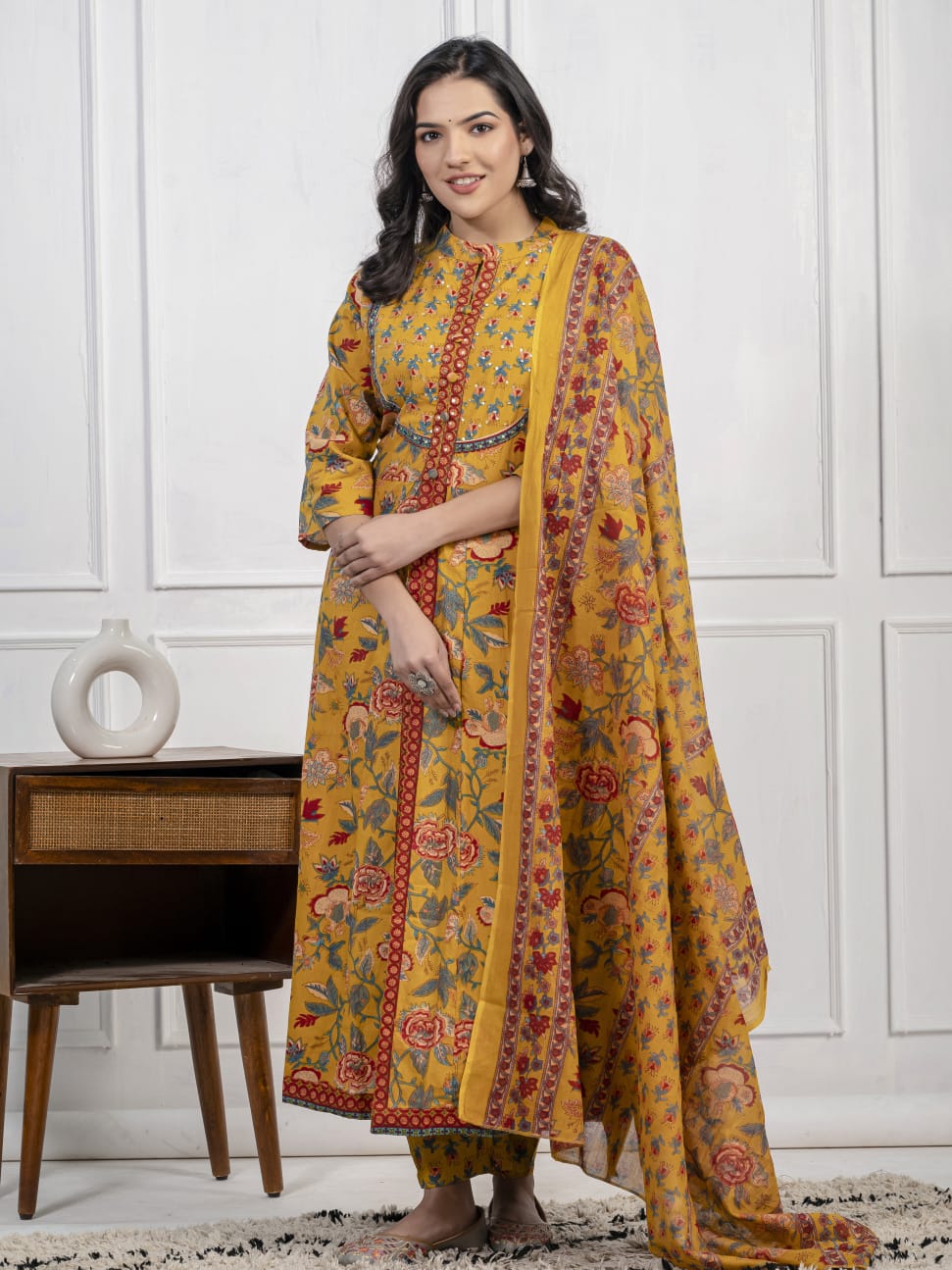 Flat 10% Buy 2 get 10% off New Cotton Festival Collection In Pure Cotton With Hand And Adda mirror Work kurti And pant Dupatta Set (WARED409)