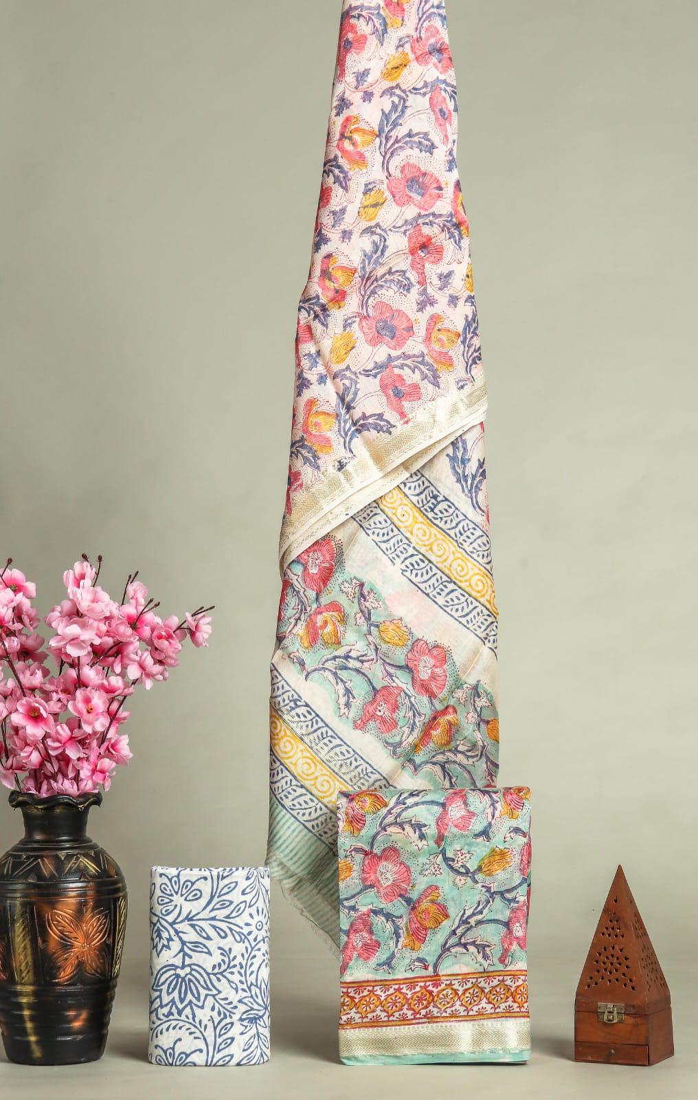 Flat 10% Buy 2 get 10% off New Exclusive Hand Block Print Maheshwari Silk Suit Set (Copy)