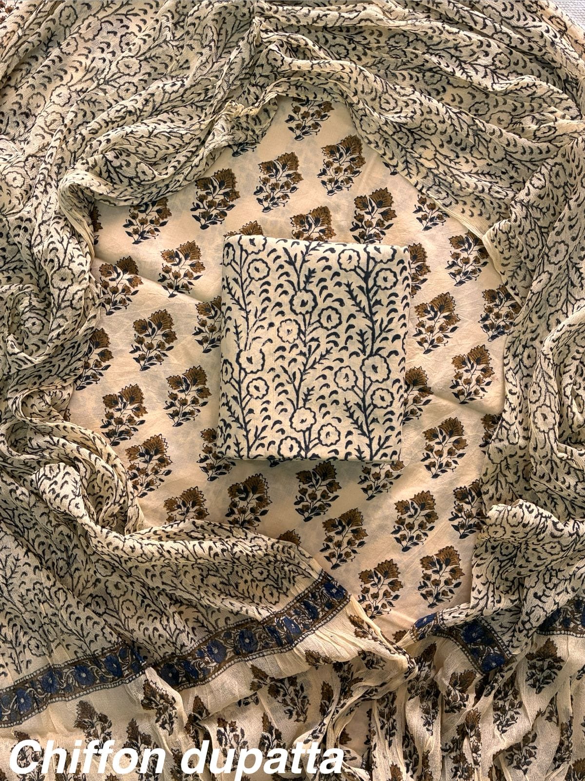Flat 10% Buy 2 get 10% off New Premium Hand Block Print Cotton Suit Set with Chiffon Dupatta(WACFCOTMU10)