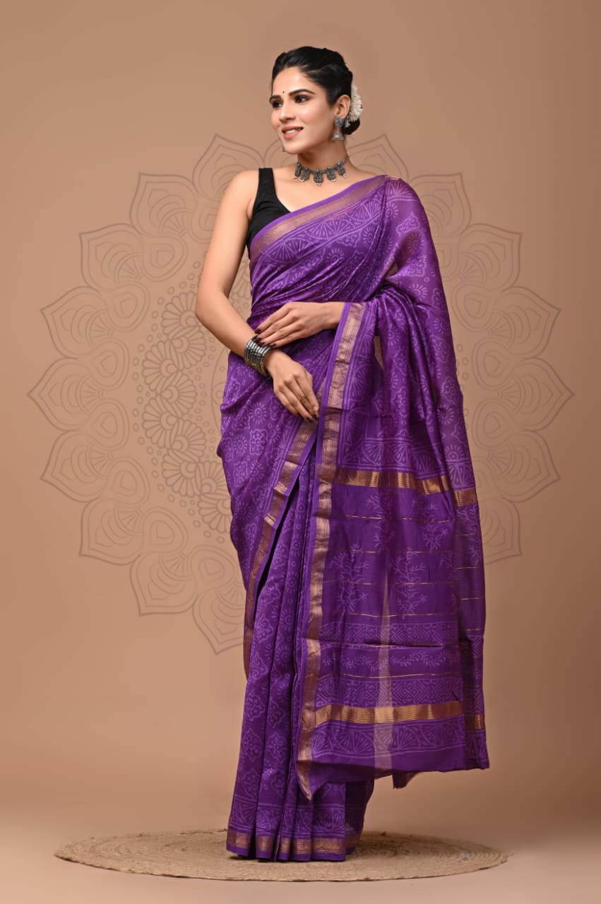 Maheshwari Silk Saree with beautiful hand block print in traditional bagru and ajrakh design .Attractive border and pallu perfect for wedding, party festivals, party, evening wear etc