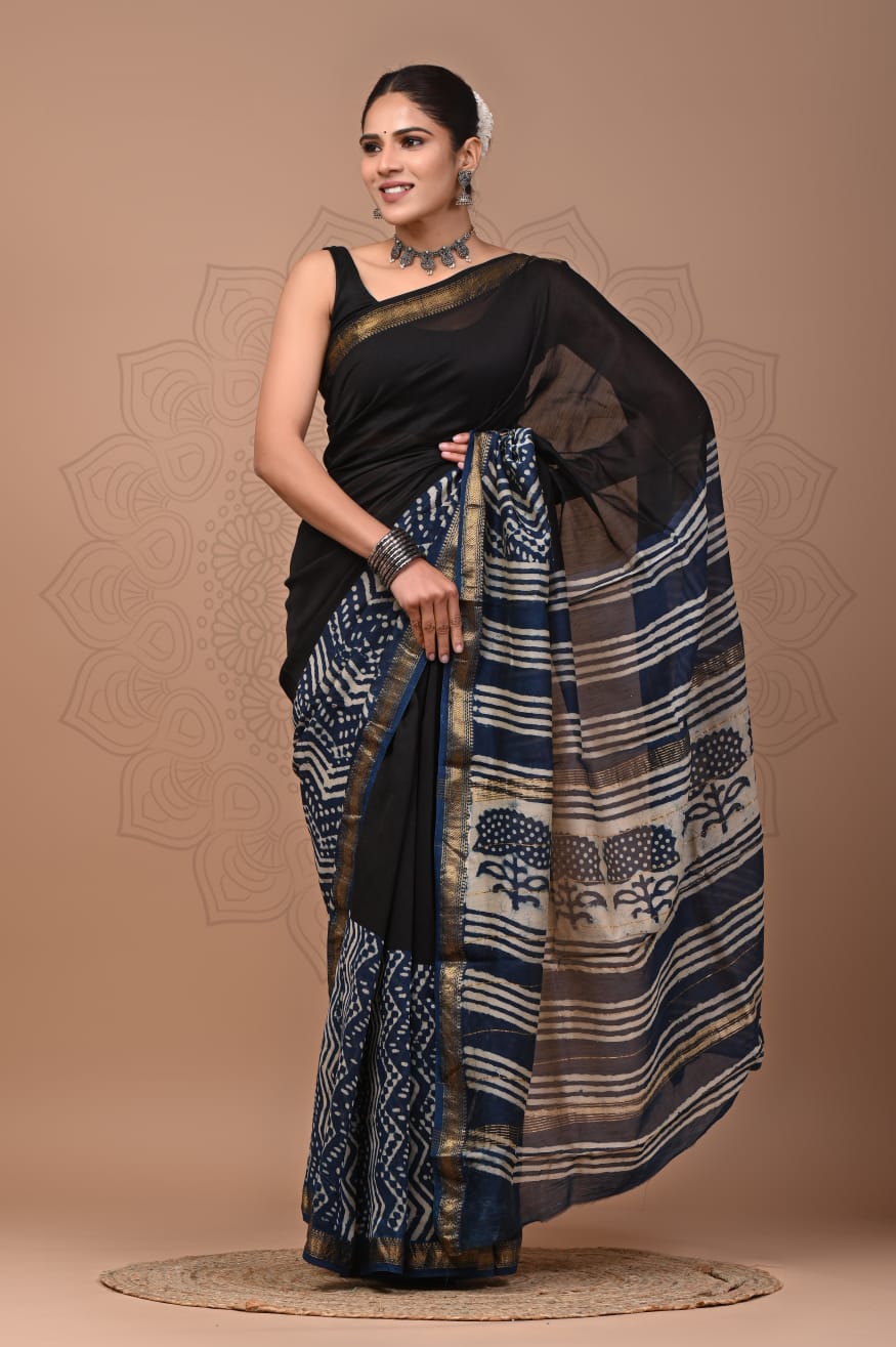 Maheshwari Silk Saree with beautiful hand block print in traditional bagru and ajrakh design .Attractive border and pallu perfect for wedding, party festivals, party, evening wear etc