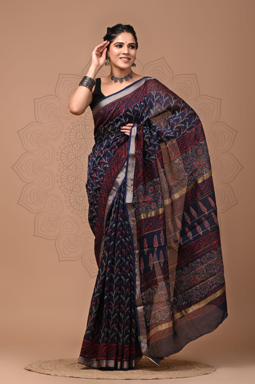 Maheshwari Silk Saree with beautiful hand block print in traditional bagru and ajrakh design .Attractive border and pallu perfect for wedding, party festivals, party, evening wear etc