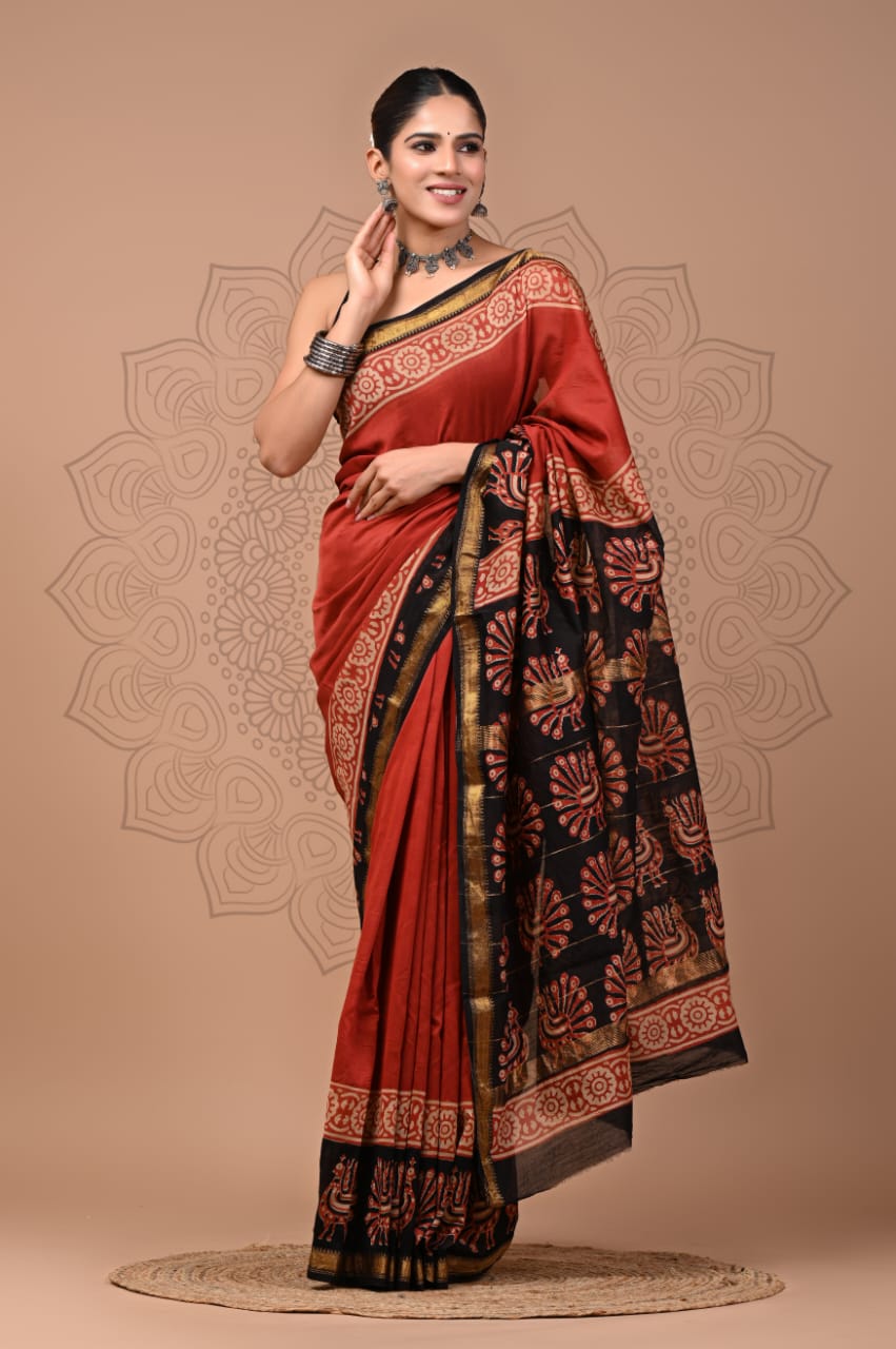 Maheshwari Silk Saree with beautiful hand block print in traditional bagru and ajrakh design .Attractive border and pallu perfect for wedding, party festivals, party, evening wear etc