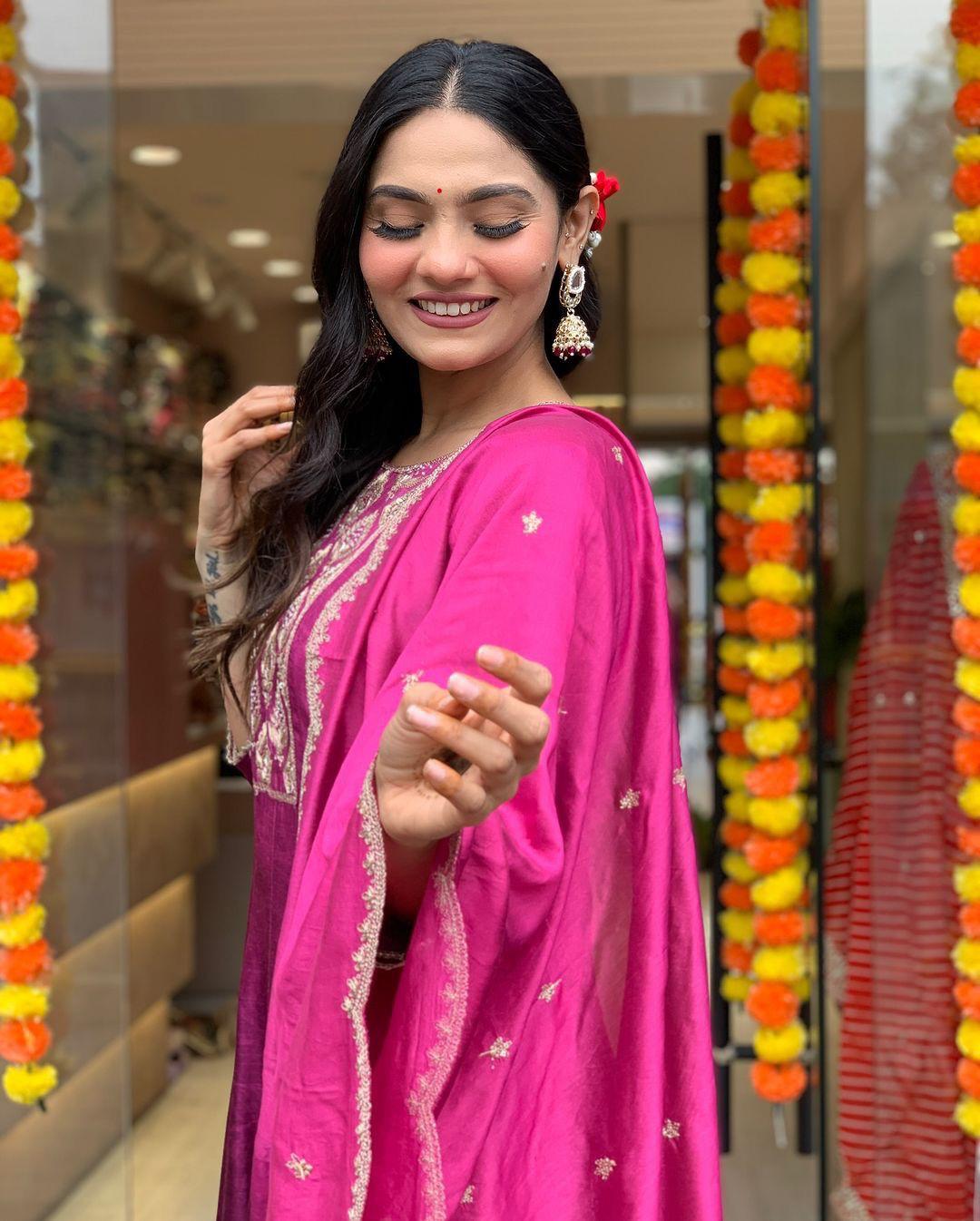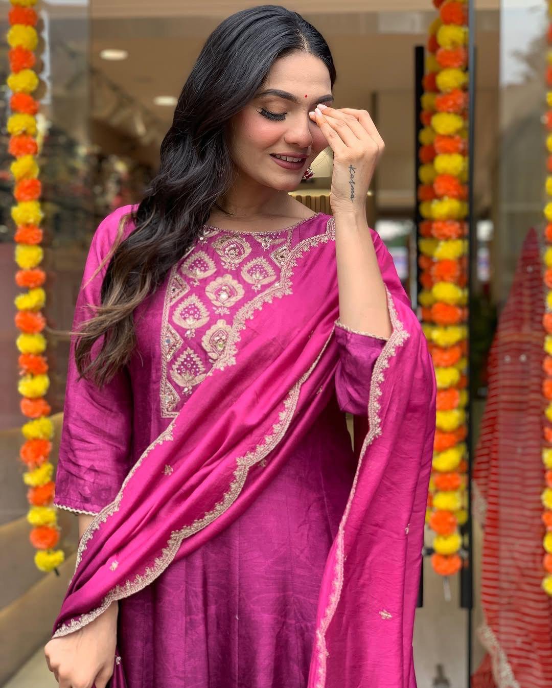 Our Exclusive Collection is here, to add a touch of tradition to your wardrobe. You've specified Chinon as the fabric. Chinon is a lightweight, slightly sheer fabric with a good drape, making it suitable for flowing garments like this. The neckline and upper yoke are heavily embroidered with intricate gold or zari work. The dupatta is made of a similar fabric as the dress and features a matching ombre effect.