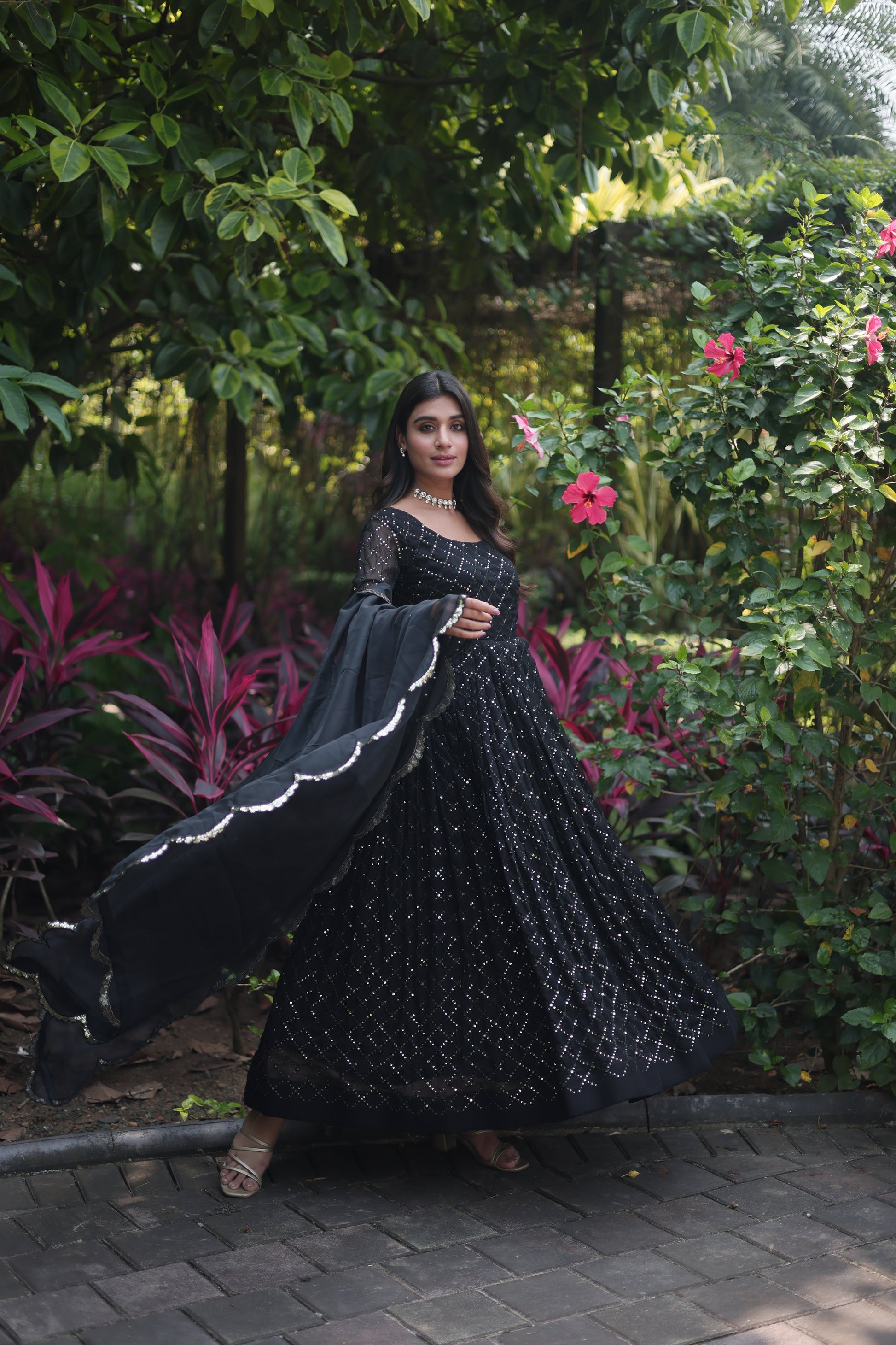 Introducing our exquisite Faux Georgette ensemble, adorned with a captivating Parallel Chex Designed Sequins-Multi and Thread Embroidered Work. This stunning piece measures 55 inches in length and features a 3.5-meter flair, ensuring a graceful drape. The cotton lining provides full coverage from top to bottom, while the regular full sleeves and fancy round neck add a touch of elegance. Expertly stitched with a standard stitching technique and Canwas Patta, this outfit guarantees a flawless fit. Accompanying this ensemble is a beautiful dupatta crafted from Russian Silk, embellished with Sequins Border Work. Measuring 2.3 meters in length, the dupatta perfectly complements the main outfit, adding an extra layer of sophistication to your overall look.
